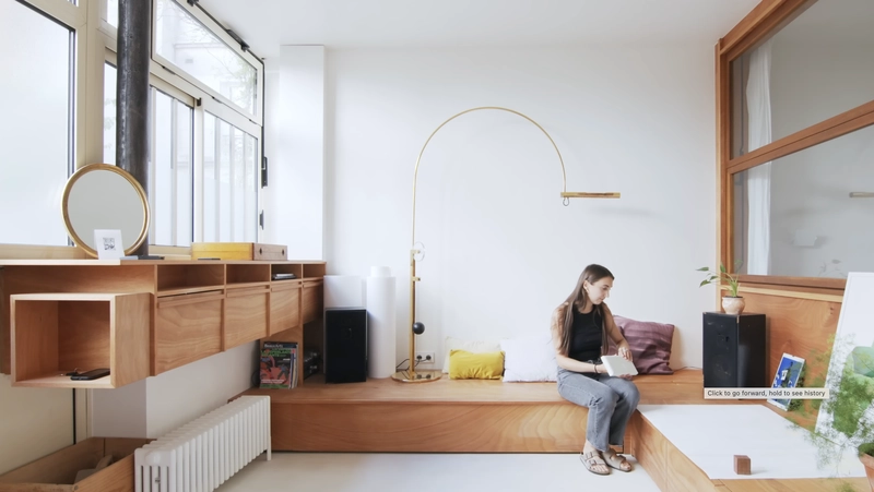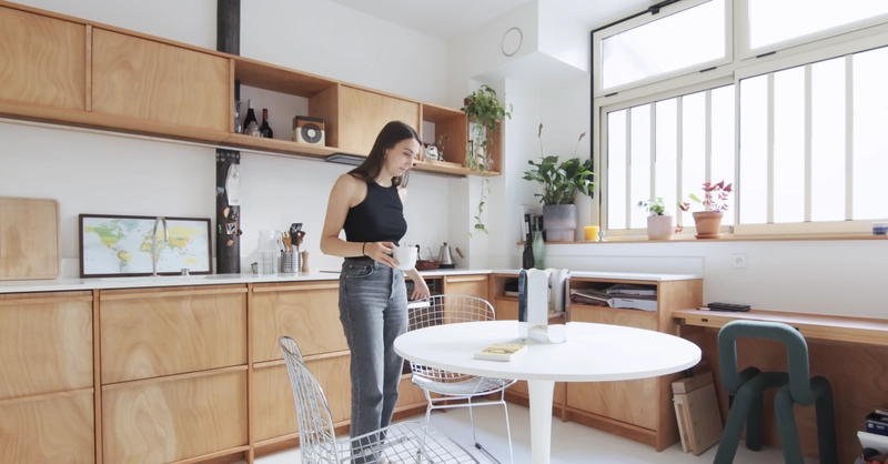 The design is rooted in a Japandi-inspired aesthetic, drawing from Scandinavian and Japanese architecture as well as the work of Charlotte Perriand. This philosophy resonates with me deeply—the idea that a space can be minimalist yet incredibly warm. To achieve this, the apartment is bathed in Okoumé plywood, a material that flows from the kitchen to the bedroom, creating a cozy, cohesive atmosphere that makes the entire space feel like it was carved from a single piece of wood.