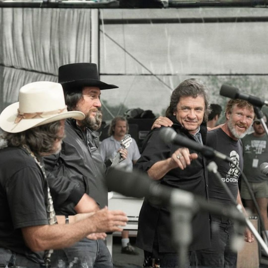 Four outlaw legends stood beneath the same stage lights: Johnny Cash, Waylon Jennings, Willie Nelson, and Kris Kristofferson. To the audience, it looked like a parade of untouchable giants—four men who had bent country music into something rougher, freer, and more honest. But those who were close to the stage that night noticed something unusual. Johnny Cash, the Man in Black, did not take command of the moment. He stood slightly back from the microphone, his posture calm, almost withdrawn, as if he were guarding a memory no one else could see.Portable speakers